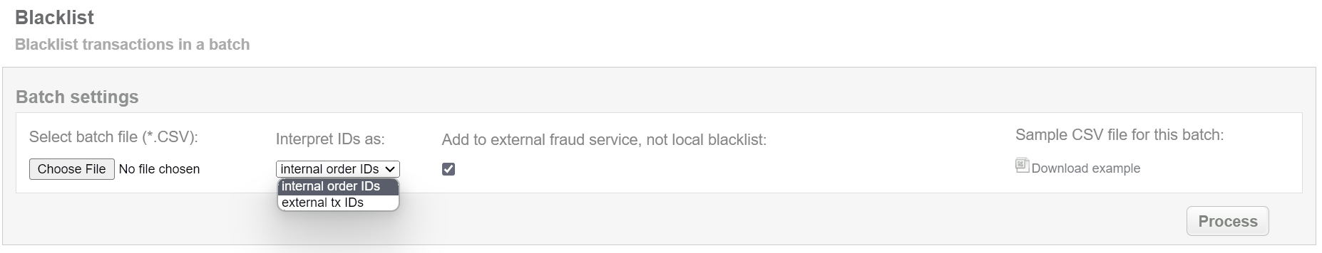 This batch operation, in according to specified input, puts cards in blacklist or external fraud system if such is set up. Collect the order IDs, assigned by Centiwise system to the CSV file and upload it to blacklist card of selected transactions. An example of CSV file for upload is available on the same screen.